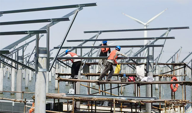 黃海新區(qū)響水片區(qū),6萬余根管樁如鋼鐵森林般矗立在碧波之中。興悅新能源420MW漁光互補(bǔ)發(fā)電項目現(xiàn)場呈現(xiàn)一片繁忙有序的景象,頭戴安全帽、身著工作服的工人們,如同靈動的音符,穿梭在一根根排列密集的工程樁之間,全神貫注地進(jìn)行著光伏支架和組件的安裝。2025-09-17 -