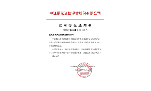 2月9日,中證鵬元資信評估股份有限公司發(fā)布《信用等級通知書》中鵬信評【2024】第Z【179】號,確定鹽城市海興控股集團有限公司主體信用等級為 AAA,評級展望為穩(wěn)定。2024-02-09 -