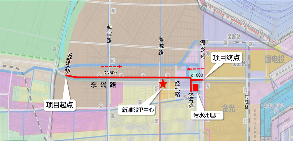 項目西起場部大橋,東至海鄉(xiāng)路,全長約7.4公里,總投資約3600萬元。其中,西段(場部大橋-經(jīng)五路)6.4公里為DN500壓力流管道,位于東興路北側(cè),負(fù)責(zé)轉(zhuǎn)輸污水處理廠以西范圍污水;東段(經(jīng)五路-海鄉(xiāng)路)1公里為d1000重力流管道,位于東興路南側(cè),負(fù)責(zé)轉(zhuǎn)輸污水處理廠以東范圍污水。近期先行實施經(jīng)七路至海鄉(xiāng)路段2.5公里污水管道,總投資約1500萬元。